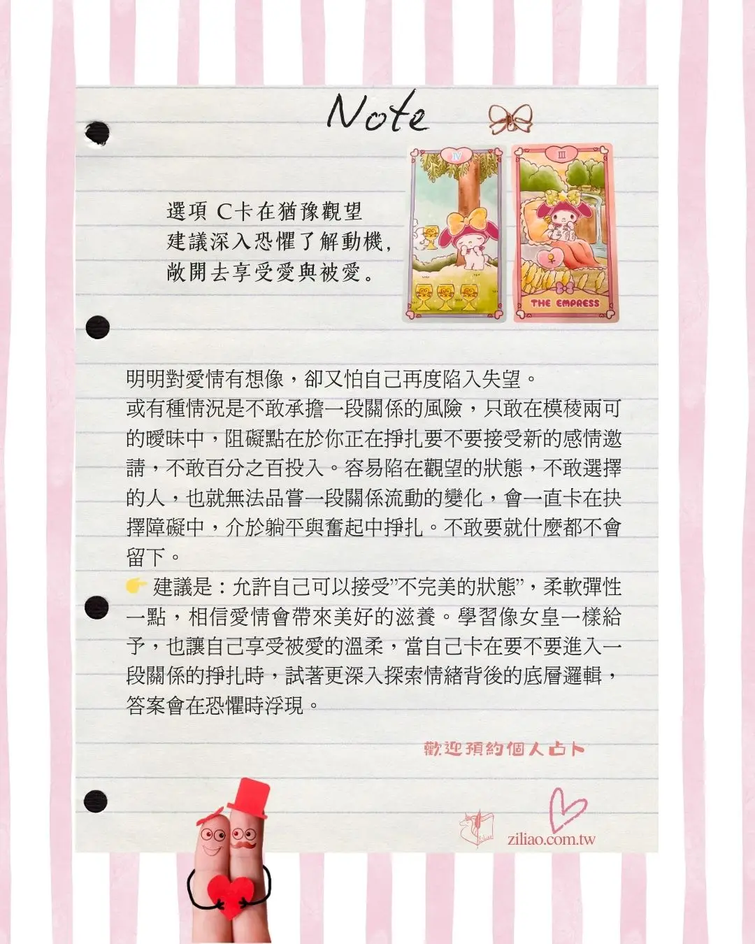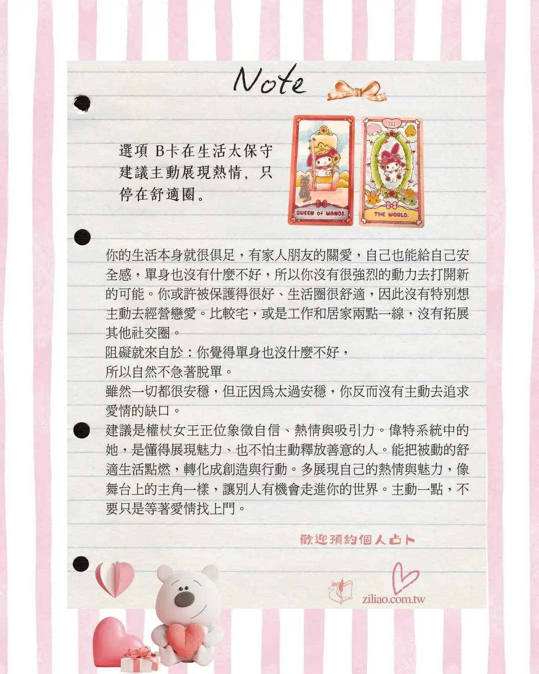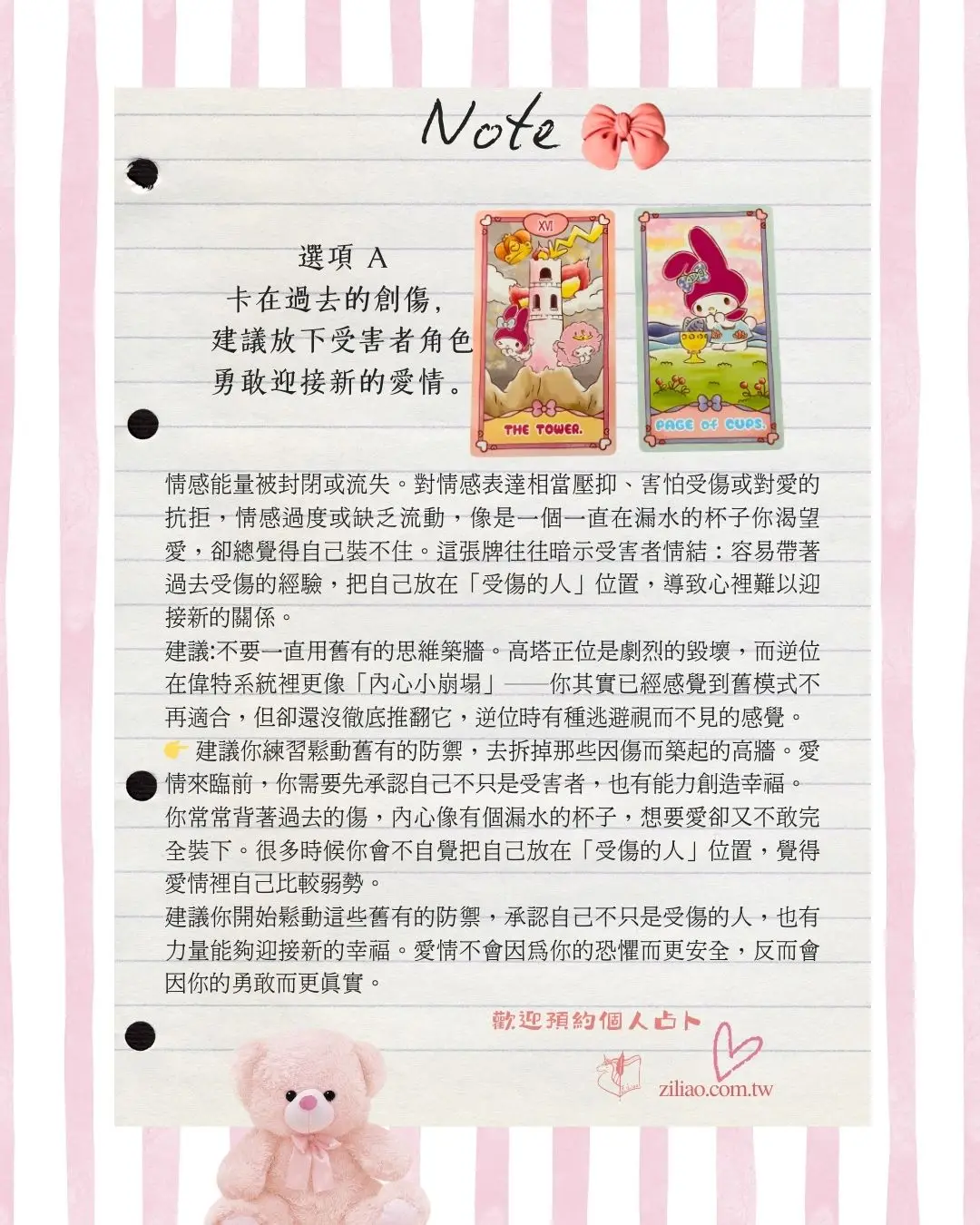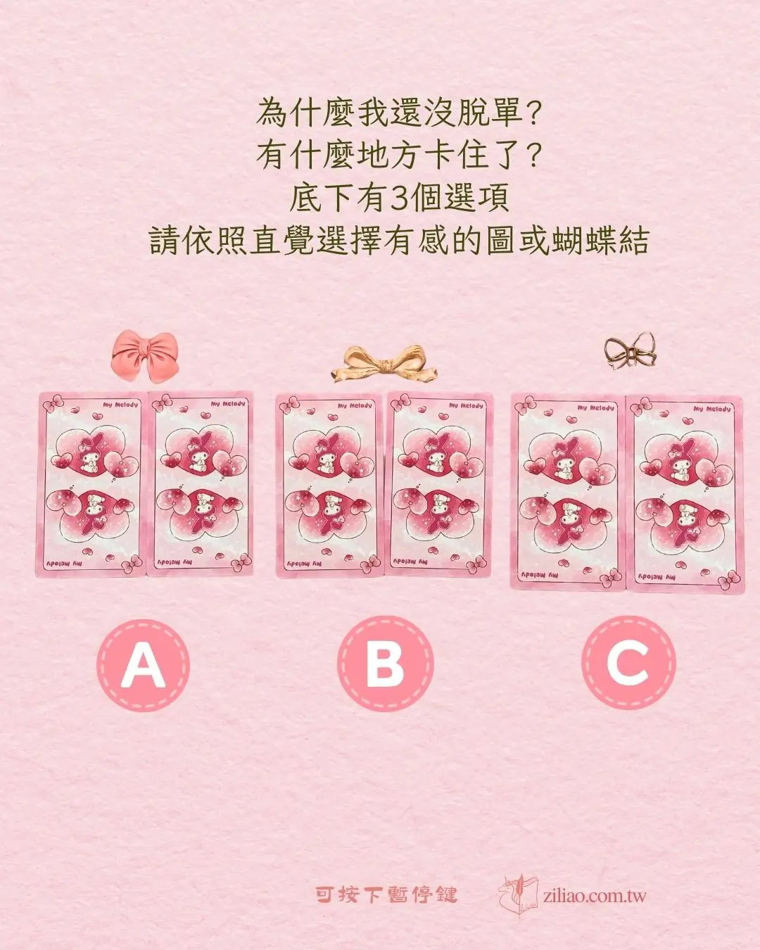 我設計了3個選項,用可愛的美樂蒂來告訴你可能的答案,為了讓大家欣賞可愛的美樂蒂每個逆位牌都會轉正,每個選項會出現一張代表阻礙的牌+一張指引的建議牌。逆位牌也不用害怕,不代表糟糕不好,而是反映真實情況。