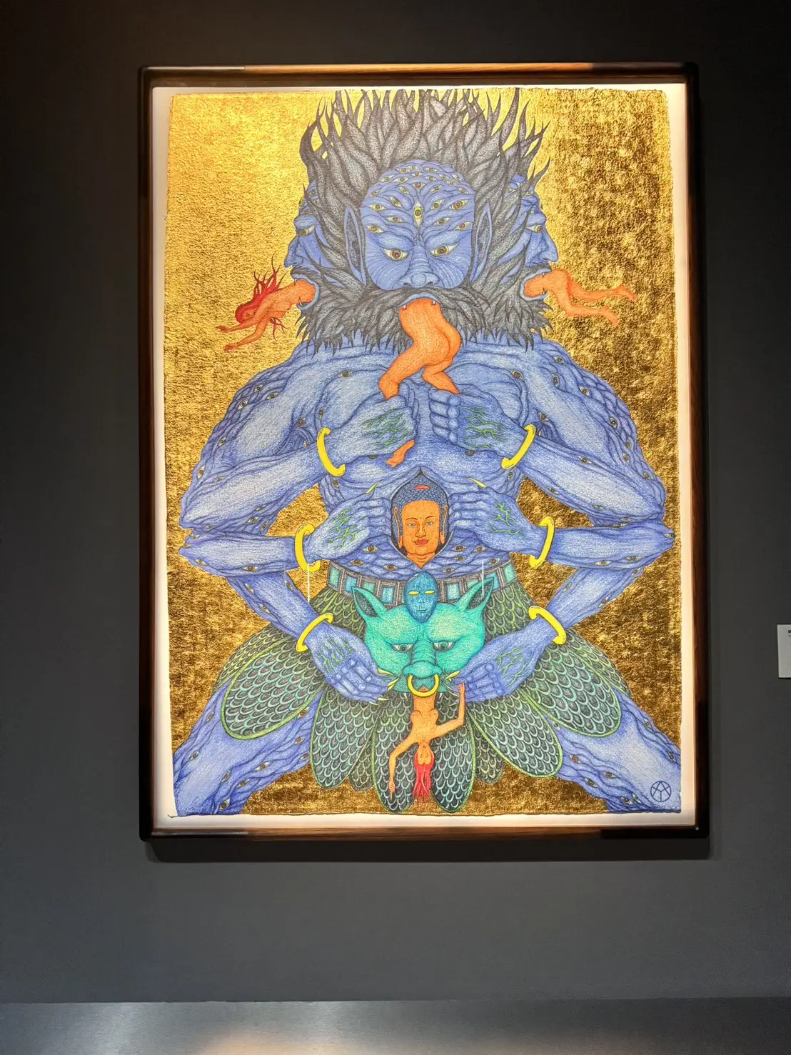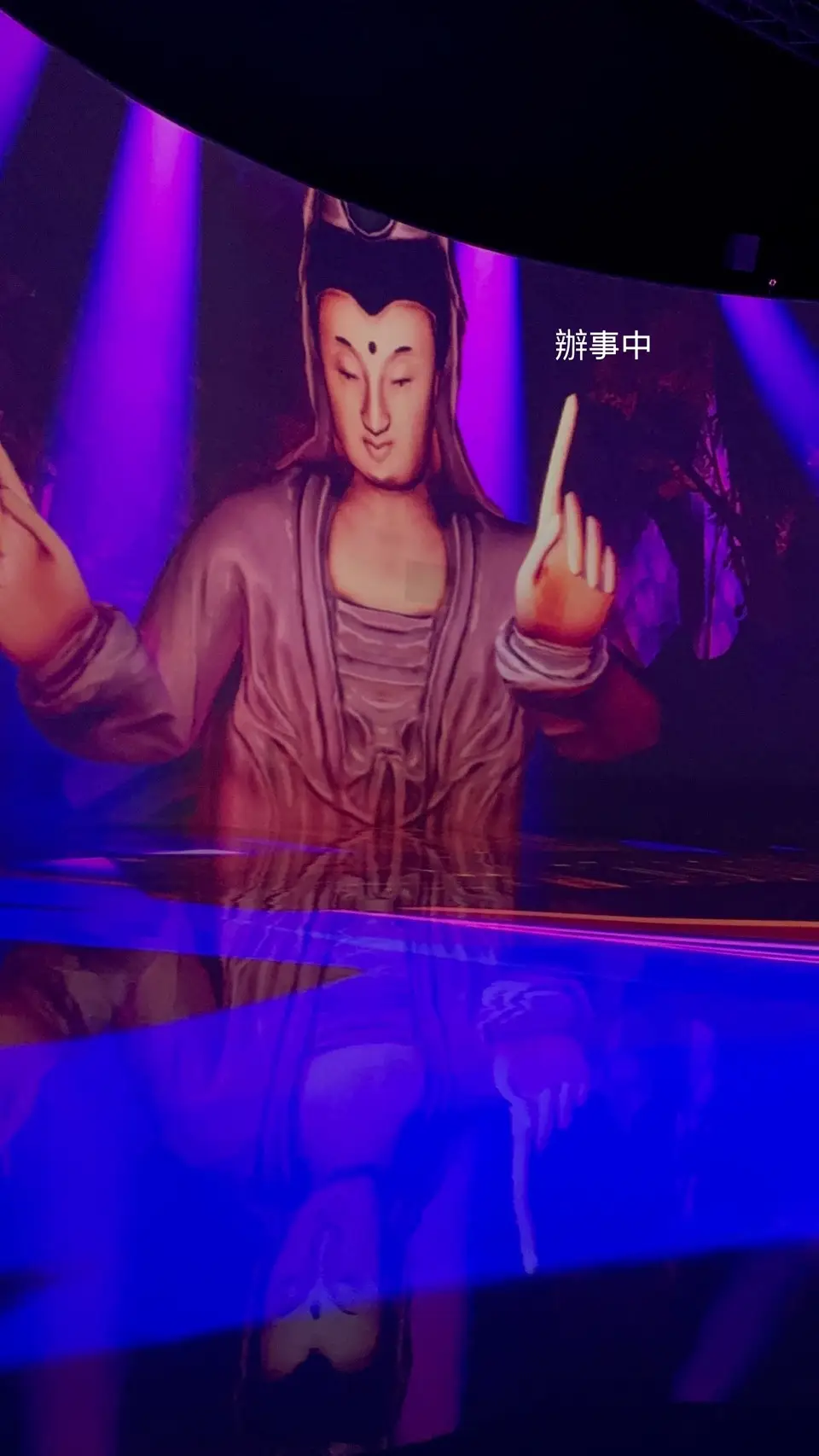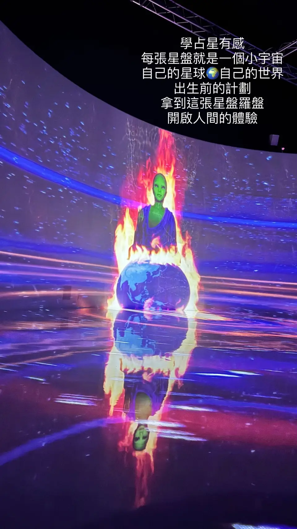 對我而言,這場展覽更觸發了關於「宇宙與人」的個人聯想。學占星以來,我常覺得每一張星盤就是一個小宇宙,是我們出生前帶來的藍圖與計劃,像是一枚羅盤,指引著我們開啟人間的體驗。看著展覽裡神祕卻荒誕的場景,我想到「降世來人間」的意義:我們既是佛,也是魔;是魔,也是佛。轉生輪迴之間,或許觀音菩薩也可能化身成 DJ,電腦也能成為神明辦事的工具。聽起來衝擊,但卻在這個展覽的氛圍裡,顯得無比合理。