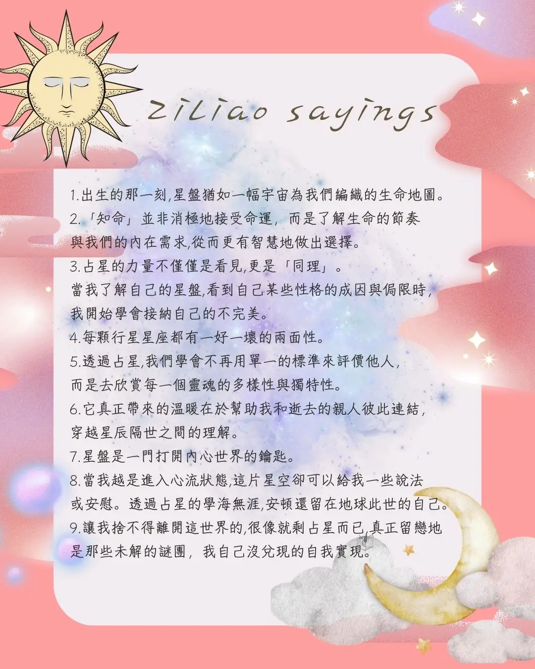 對於我來說,占星學是一門打開內心世界的鑰匙,一個幫助我們理解自我與連結他人的工具。它既是知命學,帶領我們看見自己生命中的獨特紋理,同時感受每個靈魂與宇宙的深層連結。